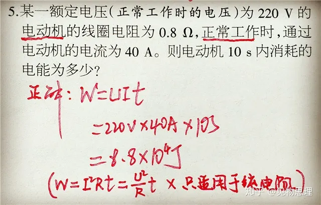 上图中的这道物理题,我们碰到了一个最应该事先提醒自己的题!那就是所有“电动机”的题都应该分两种情况来分析,一种情况是电动机处于工作状态,则是非纯电阻,另一种情况是电动机停止转动,只有内部导线发热,是纯电阻。