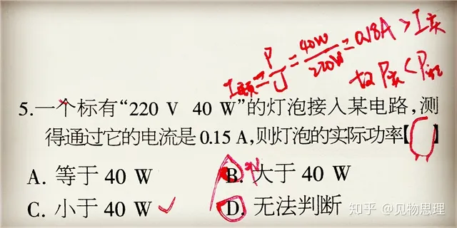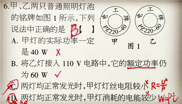 看一下下面这道题,D选项,当两灯军正常放光时,虽然甲灯的额定电功率小,但是,假如甲灯亮一年,而乙灯亮一小时,很显然,前者消耗的电能要远远大于后者!所以,必须注意第三个变量!