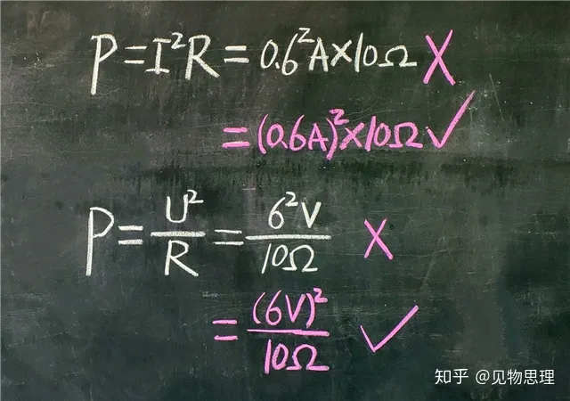 第二个易错点:就是下面黑板上所写的公式,当遇到电流I的平方或者电压U的平方时,代入的数据一定不要只把数值平方,而是要把单位一起平方!