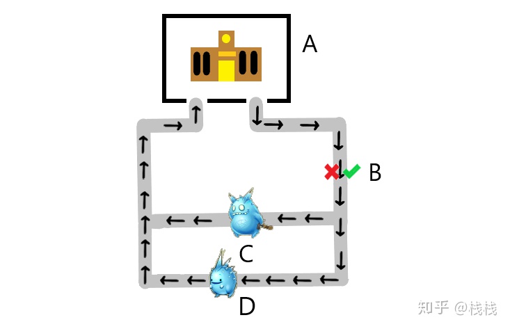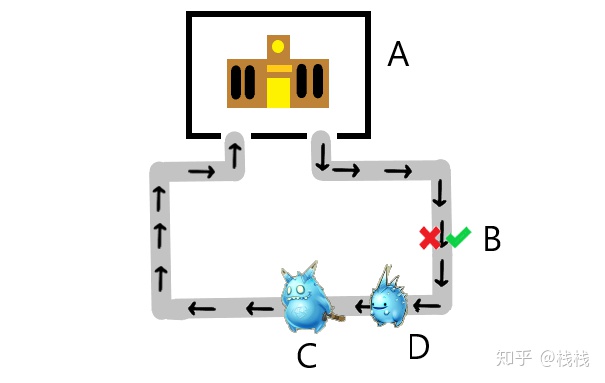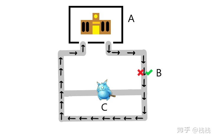 这幅图片描述的是这样的一个故事:图中的A处是一个人满为患的学校,这个学校有一个非常狠毒的校长,便把学生赶出学校,如果学生还能安全地回来,那就暂且留在学校,等待下一轮的循环。学生在路上首先会遇到B,B是一个类似于收费站的东西,可以管理这条路的通断,如果B将路断掉,学生自然无法通过,校长的计划也无法实施,学校就只能暂时挤一挤了。当B开放道路使学生通过时,通过的学生便会在路上遇见C,C是一个吃小孩儿的怪兽,学生如果能从他的嘴里逃出去,便可重新回归学校。
