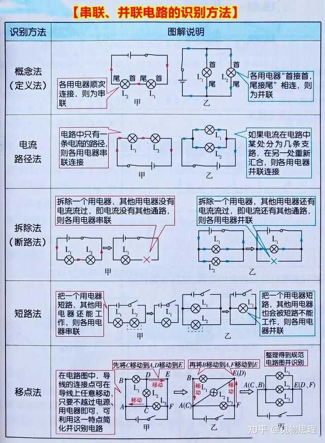 我们可以采用如下五种方法识别串并联电路!图中介绍非常清楚,需要理解并牢记,同学们遇到电学题时可以把多个方法穿插运用,可以非常方便并彻底解决此问题,此处就不再累述。