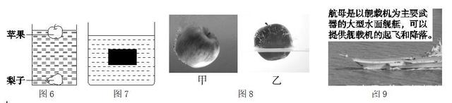 8.如图6所示,将苹果和梨子放入水中后,苹果漂浮,梨子沉底,若苹果的质量、体积及受到的浮力分别为m1、V1和F1,梨子的质量、体积及受到的浮力分别为m2、V2和F2。现有以下判断:①若m1>m2,则F1一定小于F2;②若m1=m2,则F1一定大于F2;③若V1=V2,则F1一定小于F2;④若V1>V2,则F1一定大于F2。其中正确的是()