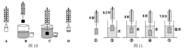 13.如图10所示,A、B、C、D四幅图是“探究浮力的大小与排开水所受重力的关系”的过程情景。请根据图示完成下面的填空。