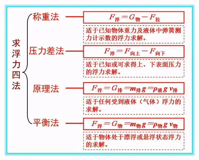 这四种求浮力的方法对应的适用条件在上图中已经叙述很清楚,这四种方法在解“浮力”题过程中,“原理法”与“平衡法”应用最广泛,也是中考物理必考知识点!而“压力差法”几乎很少出现在中考题中。称重法一般只在实验题中才会出现。所以,以后在遇到浮力相关题时,思路是非常明确的。