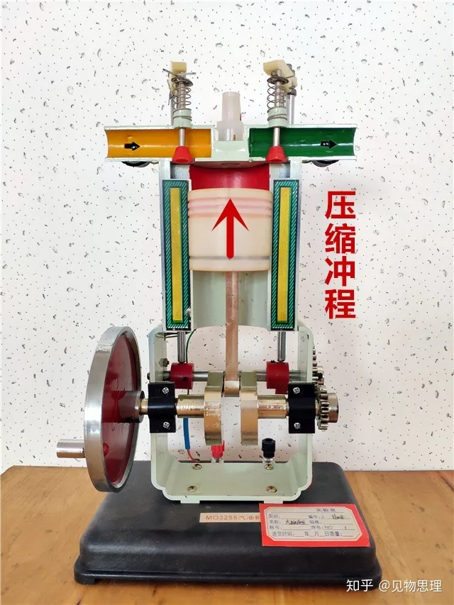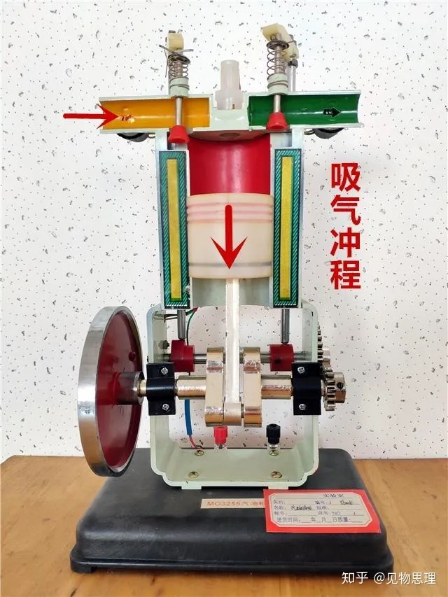 这部分学生不明白的就是“曲轴”到底是怎么带动“连杆”,又怎么顶起“活塞”的。怎么会活塞上去一次就是一个冲程?曲轴又为何只转两圈?这几个小问题其实根源都来自于没有看到真正的实验演示过程。