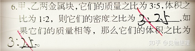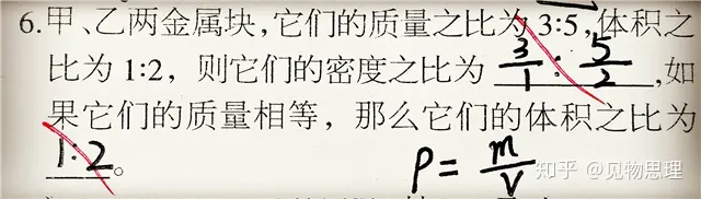 上面这位同学的第二个答案,可以肯定的说他一定没有一步一步的稳妥求解,甚至都没有写出公式,其实,对于初学者来说,由于公式还运用的不太熟练,为了避免出错并提高做题效率,最好能写出公式,然后稳步规范求解。当我们写出公式,在质量相等时,很显然可以看出体积是与密度成反比的,所以体积之比就等于密度的反比!所以上面的第二个答案比例弄反了!
