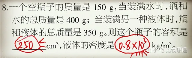 上面这道题,初学者有半数同学出错了。充分说明了初学者对于密度公式的应用非常不熟练,需要继续加强训练。上面这道题,通过空瓶质量以及装满水后的总质量可以求出水的总质量,根据密度公式,代入水的密度,即可得到水的体积,也就是空瓶子的容积!用另一种液体与瓶子的总质量减去空瓶质量,即可得到另一种液体的总质量,把此液体质量以及空瓶体积代入密度公式,即可求出液体密度!