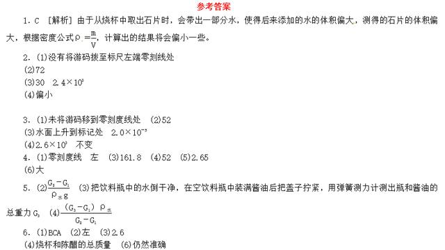 1.小江进行了如下测量:①用天平测石片的质量m。②往烧杯中加适量水,使其浸没石片,在水面位置做上标记;取出石片,用量筒取水缓慢倒入烧杯,让水面升至标记处,如图所示,量筒内倒出水的体积即为石片的体积。③计算出石片的密度ρ。根据以上步骤,测出的密度值()