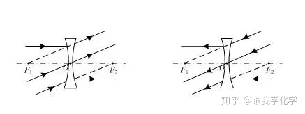 (2)凹透镜:中间薄,边缘厚的透镜,对光线具有发散作用,有2个虚焦点。