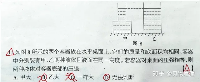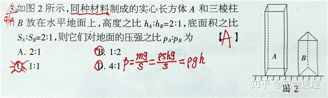 但是很多出错的学生错选了C,他们直接凭借想象而不是通过公式得出此结果。他们以为A对地面的压力比B对地面的压力大,而A的底面积也大,因此想当然的以为二者压强相等!