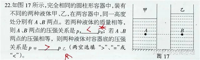 首先我们要知道,如果选择液体压强公式p=ρgh就无法判断AB两点的压强关系。因此我们必须选择压强的定义式p=F/s来解决第一个问题。