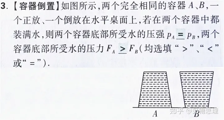 于是,第二个问题得以解决:压力等于容器重力和内部液体重力之和,由于容器质量相同,所以其重力相同,由于液体是同种液体,也就是密度相同,所以,其质量取决于体积大小,由此可以非常快速的得出结果。