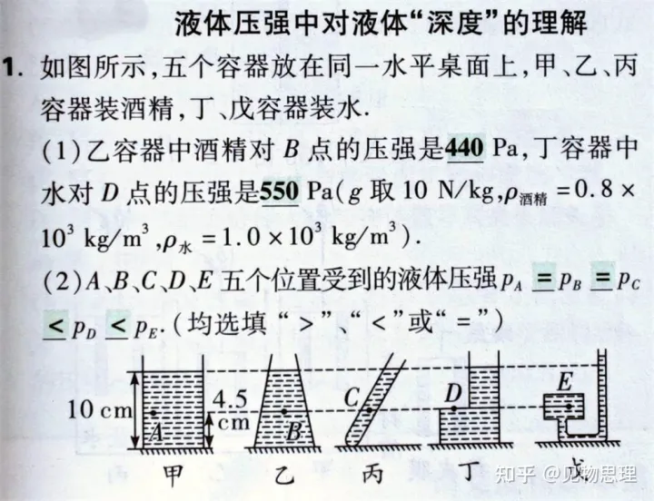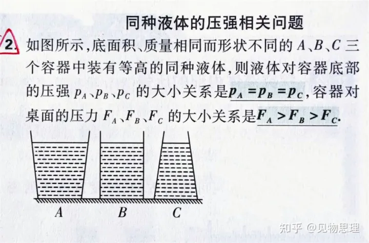 这就意味着,当我们利用液体压强公式p=ρgh时,可以一眼看出三者液体产生的压强相等。至于第二个问题,我们首先要解决一个基本问题: