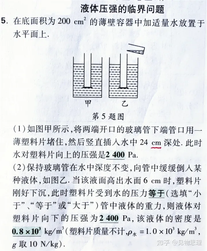 第二问,给我们的启发是,既然倒入管中的液体高度比容器中的水面高,说明此液体密度低于水!既然此时塑料片“刚好下沉”就是说塑料片受到水的压力等于管中液体的重力,而管中液体产生的压强也等于外部水产生的压强。