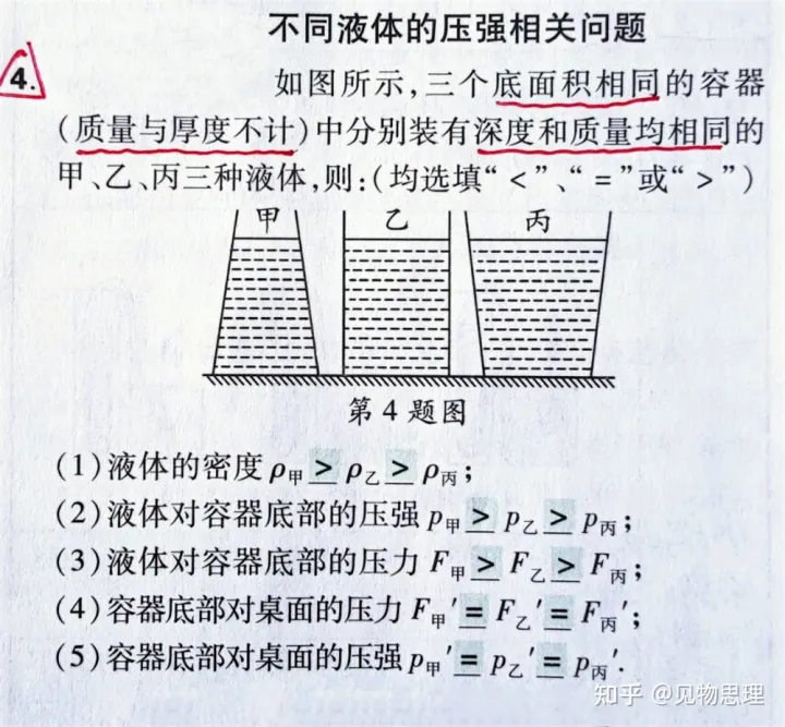 比如下面这道题,三个底面积相同的容器,液体深度和质量均相同,于是,经典的五个问题出现了。