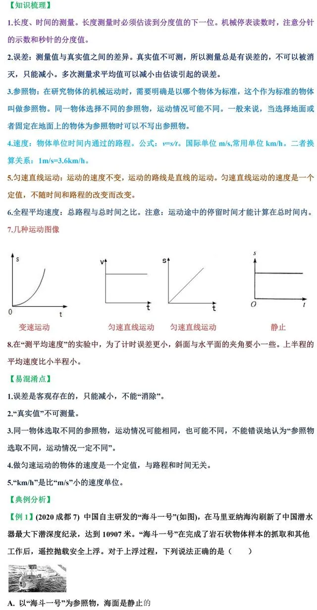 实验原理:v=s/t;实验器材:斜面、金属片、小车、刻度尺和停表;刻度尺的作用:测量小车运动的路程;停表的作用:测量小车运动的时间;斜面的作用:使小车获得下滑的速度;金属片的作用:确定小车运动的终点在某一位置;斜面的倾角不宜过大的原因:防止小车滑行太快,方便测量时间;斜面的倾角不宜过小的原因:防止各阶段测出的平均速度太接近。