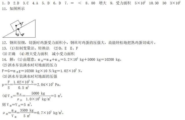 14.目前全国有至少5000台油罐车面临报废,为了把高危运输的油罐车变废为宝,可以把它改装为罐体管道大体一致的洒水车。若一辆改装后的洒水车空车质量5.2t,灌入5000kg的水能将水罐装满,六个车轮与地面的总接触面积为0.5m2。设该车改装前后空车质量和罐体容积不变(g取10N/kg,ρ水=1.0×103kg/m3)。问: