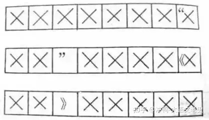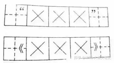 上引号写在格子的右上角,并要紧贴标示的文字;下引号写在格子的左上角,也要紧贴所标示的文字。上引号和下引号各占一格。