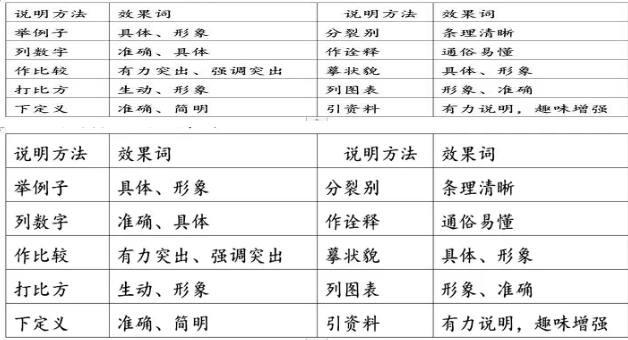 ⑩.引用说明:能使说明的内容更具体、更充实。用引用的方法说明事物的特征,增强说服力,如引用古诗文、谚语、俗话。引用说明在文章开头,还起到引出说明对象的作用。