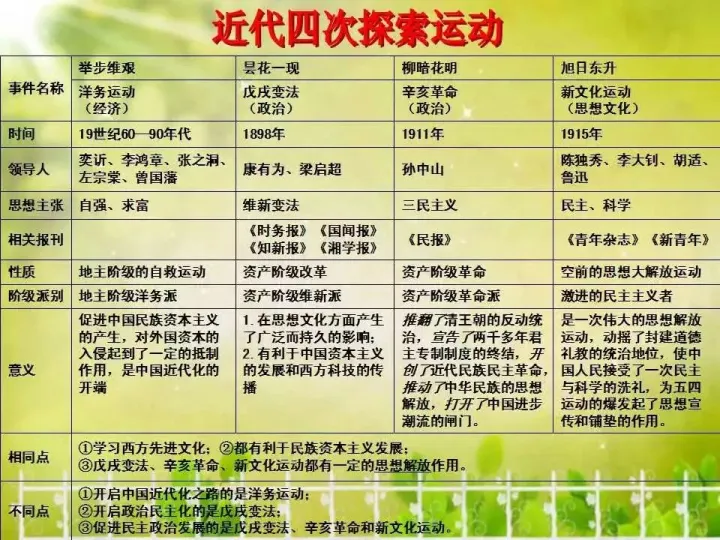 中国近代化探索包括的主要历史事件:洋务运动、百日维新、辛亥革命、新文化运动