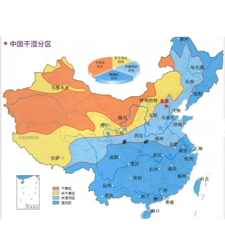 (4)800 毫米等降水量线(湿润区和半湿润区界线):沿着青藏高原东南边缘,向东经过秦岭-淮河一线。