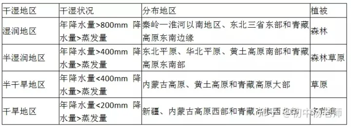 (4)我国干湿地区的划分:根据降水量与蒸发量的关系,我国从东南沿海到西北内陆可划分为四类干湿地区,概况如下表:
