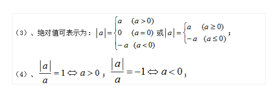 (1)、只有符号不同的两个数叫做互为相反数。① 注意:a的相反数是-a;a-b的相反数是b-a;a+b的相反数是-(a+b)=-a-b;② 非零数的相反数的商为-1; ③ 相反数的绝对值相等。(2)、一般地,设a是一个正数,数轴上与原点的距离是a的点有两个,他们分别在原点的两侧,表示a和-a,我们说这两点关于原点对称。(3)、a和-a互为相反数。0的相反数是0,正数的相反数是负数,负数的相反数是正数。相反数是它本身的数只有0。(4)、在任意一个数前面添上“-”号,新的数就表示原数的相反数。(5)、若两个数a、b互为相反数,就可以得到a+b=0;反过来若a+b=0,则a、b互为相反数。(6)、多重符号的相乘由“-”的个数来定:若“-”的个数为偶数,相乘结果为正数;若“-“的个数为奇数,化简结果为负数。比如:-2×4×(-3)×(-1)×(-5),首先由4个负号,所以最终结果是正数,再算数字相乘得到120