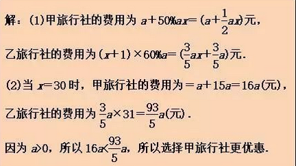 奥鹏学习网【aopeng123.cn】整理了关于2023年中考数学复习:整式应用题(2),希望对同学们有所帮助,仅供参考。暑假期间,学校组织学生去某景点游玩,甲旅行社说:“如果带队的一名老师购买全票,则学生享受半价优惠”;乙旅行社说:“所有人按全票价的六折优惠”.已知全票价为a元,学生有x人,带队老师有1人.(1)试用含a和x的式子表示甲、乙旅行社的收费;(2)若有30名学生参加本次活动,请你为他们选择一家更优惠的旅行社.