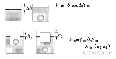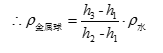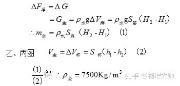 比较第二个状态和第一个状态,即:ΔF浮= G金 ,代入浮力和重力公式后:ρ水 g ΔV排=ρ金 g V金