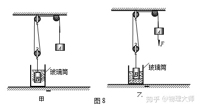 例4如图8甲所示的装置处于静止状态,底面积为60cm2的圆柱形玻璃筒中装有适量的水,放在水平台面上,质量为800g的圆柱形物体B浸没在水中,此时水对容器底的压强是2500 Pa,物体A是体积为50cm3的圆柱体配重。如图8 乙所示,当用力F竖直向下拉物体A时,物体B有的体积露出水面且静止,此时滑轮组提升重物B的机械效率为80%,水对容器底的压强为2100 Pa。g取10N/kg,悬挂物体的细绳的质量以及绳与轮间的摩擦忽略不计,物体A的密度是______kg/m3。