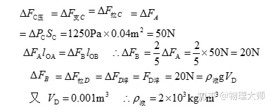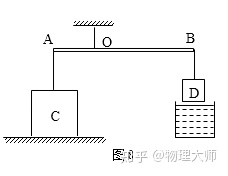 例3如图8所示,杠杆AB的A点挂边长为2dm、密度为ρ1=2kg/dm3的正方体C,B点挂边长为1dm正方体D,AO:OB=2:5,杠杆在水平位置平衡时,D静止在空中,C对水平地面的压强为p1=1000Pa;若将正方体D浸没在某种液体中(未接触到容器底),杠杆在水平位置平衡时,C对水平地面的压强增大了1250Pa,取g=10N/kg,可求得( )