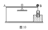 3.如图10所示,顶面带有光滑凹槽的轻质杠杆AB可以绕支点O转动,杠杆的A端用细线沿竖直方向连接在地板上,OB=0.5m,在杠杆的B端悬挂一个密度为0.8×103kg/m3的圆柱体M。地板上有一个盛满水的容器。在圆柱体M体积的1/3浸入水中时,从容器内溢出0.4N的水,杠杆在水平位置平衡。此时让一个质量为200g的小球从B点沿凹槽向A端匀速运动,经过4s的时间,系在A端细线的拉力恰好等于0N。若整个过程中杠杆始终保持水平平衡,则小球的运动速度为________m/s。(g取10N/kg)