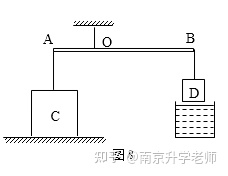 例3如图8所示,杠杆AB的A点挂边长为2dm、密度为ρ1=2kg/dm3的正方体C,B点挂边长为1dm正方体D,AO:OB=2:5,杠杆在水平位置平衡时,D静止在空中,C对水平地面的压强为p1=1000Pa;若将正方体D浸没在某种液体中(未接触到容器底),杠杆在水平位置平衡时,C对水平地面的压强增大了1250Pa,取g=10N/kg,可求得( )