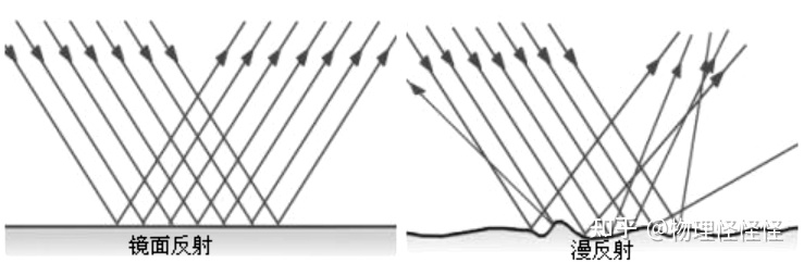 2、漫反射:光线照到凹凸不平的表面上,发生漫反射。凹凸不平的表面会把光线向四面八方反射。