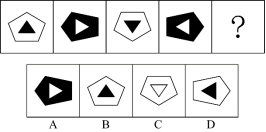 【答案】B。本题组成元素相同,考虑动态位置。题干中五边形一直在逆时针旋转90度,三角形顺时针旋转90度,且两个图形的黑白颜色一直在互换,符合此要求的只有B项。选项ACD不合题意,故本题正确答案选择B项。
