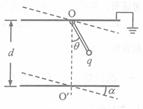 (14分)如图,一对平行金属板水平放置,板间距为d,上极板始终接地。长度为d/2、质量均匀的绝缘杆,上端可绕上板中央的固定轴0在竖直平面内转动,下端固定一带正电的轻质小球,