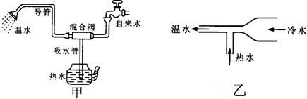 有一种家庭使用的淋浴器,设备很简单,设计却很巧妙,如图甲.淋浴器有两个进水口,一个是冷水口,一个是热水口,冷水口直接与自来水管连接,热水口的管道很细,混合阀如图乙,插在一壶热水里.使用的时候,拧开自来水龙头,热水会自动向上流,冷水热水混合以后,从喷头里喷出了适宜淋浴的温水.