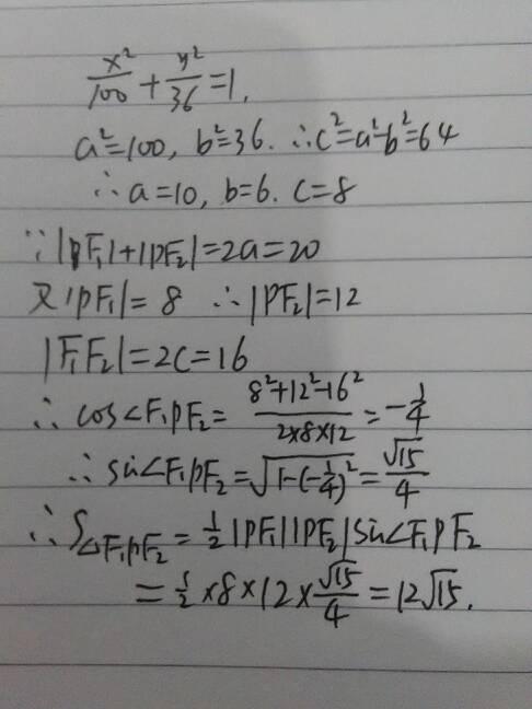 若椭圆x2/100+y2/36/=1上有一点P,且P到椭圆的左焦点F1的距离为8,求ΔPF1F2的面积