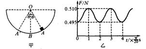 ,均小于10 0 ,图乙表示滑块对器壁的压力F随时间t变化的曲线,且图中t=0为滑块从A点开始运动的时刻。试根据力学规律和题中(包括图中)所给的信息,求小滑块的质量、容器的半径及滑块运动过程中的守恒量。(g取10m/s 2 )