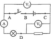 | 分析:BC两点在电源的两端,若连接这两点,则电源会短路,连接AC时,当开关闭合后也会造成电源短路,故导线不能连接BC、AC两点间; 若连接AD两点,它把电流表和灯泡短路了,则在电键闭合前后,电路中电流表的示数始终为零;若连接BD两点,开关闭合与断开时电流表的示数也始终为零;若连接在DC两点,则闭合开关S前后,电压表V2的示数始终为零;故满足题意要求的连接有三种AD、BD、CD。 |