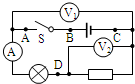 (2)根据电路图可知,灯泡和电阻串联,V1测电源电压,V2测定值电阻的电压;若导线连接的是CD两点,则定值电阻和电压表V2被短路,因此闭合电键S前后,电压表V2的示数始终为零.