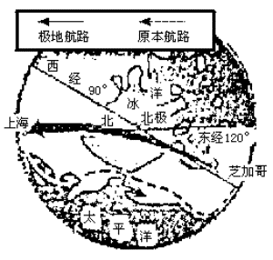 | (1)在开辟“极地航路”前,中国东方航空公司的飞机在北京时间7月8日下午3时从上海直飞洛杉矶(西八区),到达时当地时间是7月8日上午10时,该飞机的飞行时间是( ? ) A.19小时??? ? B.11小时 ??? C.8小时??? ??? D.15小时 (2)最近东航公司成功地开辟了从美国芝加哥飞越北极直达上海的新航线,它的最大好处是 ?? 。 (3)看图判断该极地航线经过了下列哪些国家的领空( ? ) A.瑞典 ??? B.日本 ??? C.俄罗斯??? ? D.加拿大
