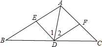 如图,AD是三角形ABC的角平分线,DE‖CA,并且交AB与点E,∠1=∠2,DF与AB是否平行?为什么?