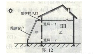 图12是某建筑设计院为我国北方地区设计的一幢高效利用太阳能的房屋模型。读图回答问题。1.绝热窗户设计成倾斜的主要目的是()(A)雨季及时排水