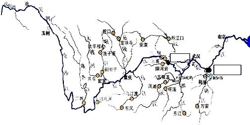 看图按要求完成各题.(1)长江水能资源主要集中在游河段.有之美称.(2)长江的航运价值极高,有之美称.(3)请你在图中方框填写长江上中下游分界点.
