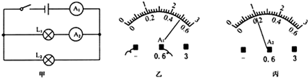 在图甲所示的电路图中,L1和L2是并联连接的.开关闭合时,A1和A2两个电流表的示数分别如图乙和图丙所示,判断A2的示数是A;流过灯L2的电流大小是A.