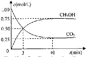 | (I)随着人类对温室效应和资源短缺等问题的重视,如何降低大气中CO 2 的含量及有效地开发利用CO 2 ,引起了各国的普遍重视。 (1)目前,用超临界CO 2 (其状态介于气态和液态之间)代替氟利昂作冷剂已成为一种趋势,这一做法对环境的积极意义在于 。 (2)将CO 2 转化成有机物可有效实现碳循环。CO 2 转化成有机物的例子很多,如: a. 6CO 2 +6H 2 O C 6 H 12 O 6 +6O 2 b.CO 2 +3H 2 CH 3 OH+H 2 Oc.CO 2 +CH 4 CH 3 COOHd.2CO 2 +6H 2 CH 2 =CH 2 +4H 2 O以上反应中,最节能的是 ,原子利用率最高的是 。 (3)为探究用CO 2 来生产燃料甲醇的反应原理,现进行如下实验: 在体积为1L的密闭容器中,充入1molCO 2 和3molH 2 ,一定条件下发生反应: CO 2 (g)+3H 2 (g) CH 3 OH(g)+H 2 O(g)△H=-49.0kJ/mol测得CO 2 和CH 3 OH(g)的浓度随时间变化如图所示。 ①从反应开始到平衡,氢气的平均反应速率v(H 2 )= 。 ②该反应的平衡常数表达式为 ,升高温度,平衡常数的数值将 (填“增大”、“减小”或“不变”)。 ③下列措施中能使n(CH 3 OH)/n(CO 2 )增大的是 .