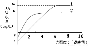 在两个密闭透光的体积为1L容器的小室中,分别放置大小、生长状况相似的A、B两种植物。下图曲线①、②为小室中植物A、B随着光照强度变化所测的CO2吸收量(不考虑温度对呼吸量的影响)。请回答: