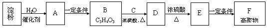 (6分)与淀粉相关的物质间转化关系如下图所示。其中B的分子中含有一个甲基,B与羧酸和醇均能发生酯化反应;C的催化氧化产物既是合成酚醛树脂的原料之一,又是常见的居室污染物