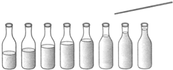 由此结合题目所给的图可知可以知道:敲击时振动的是水和瓶子,从左到右敲击音调越来低.